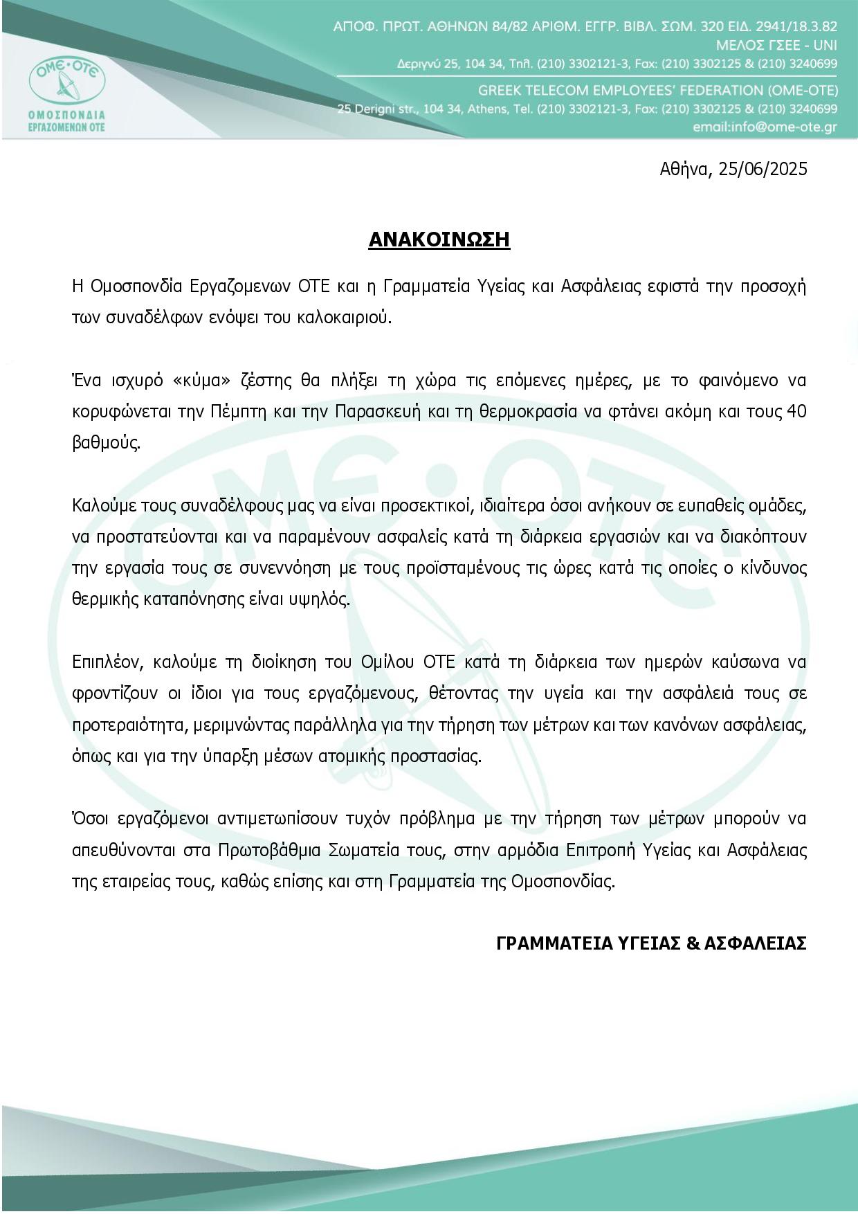 Ανακοίνωση για Υγεία & Ασφάλεια