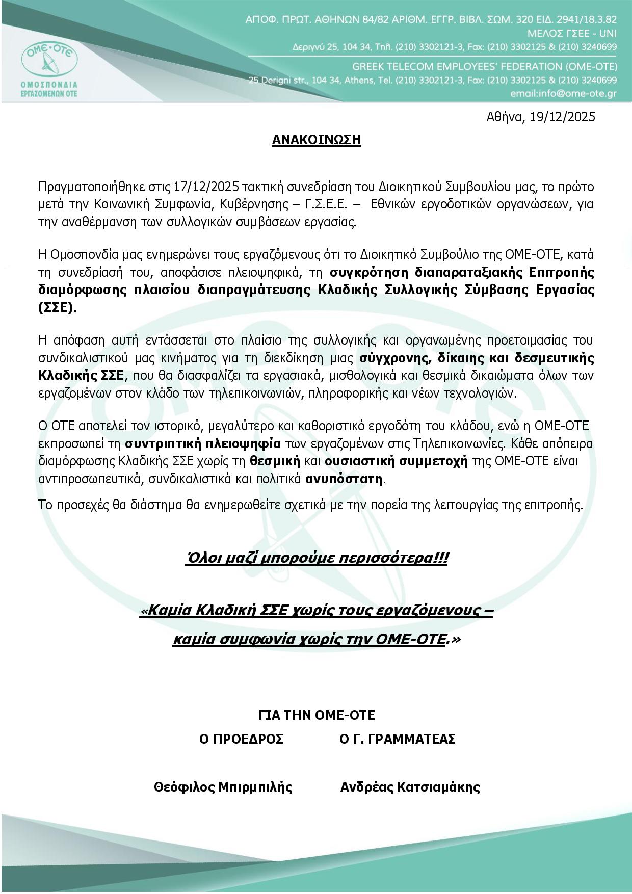 Αποφάσεις ΔΣ ΟΜΕ-ΟΤΕ για Κλαδική ΣΣΕ